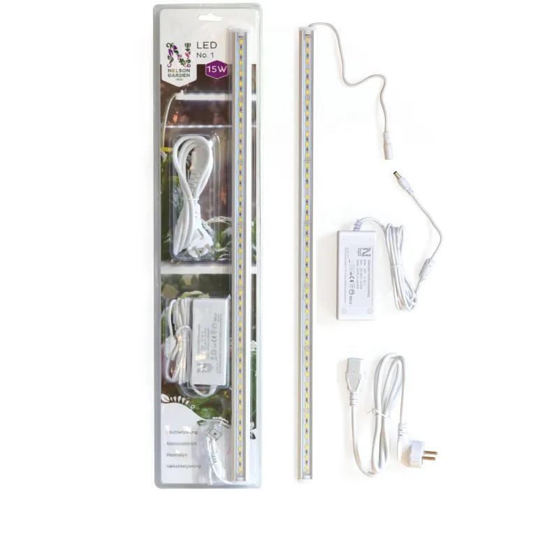 Energiaa säästävä LED-lista adapterilla. Listaan voidaan kytkeä kaksi LED-lisälistaa (LED nro 2, Nelson Garden -tuotenro 5568). Sopii esikasvatukseen ja lisävaloksi sisäviljelmille.