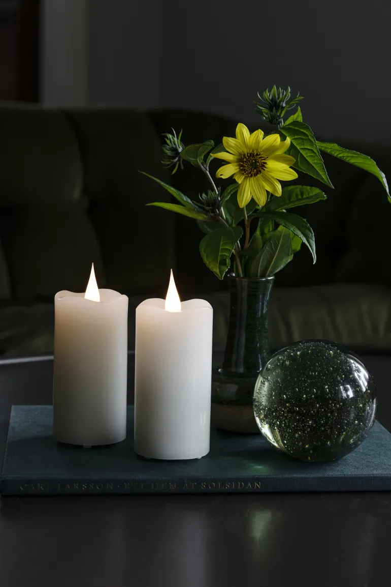 Konstsmide 1887-185 on pari kermanvalkoisia LED-vahakynttilöitä (valon väri lämpimän valkoinen). 5×10 cm, ajastin 4/8 h.
