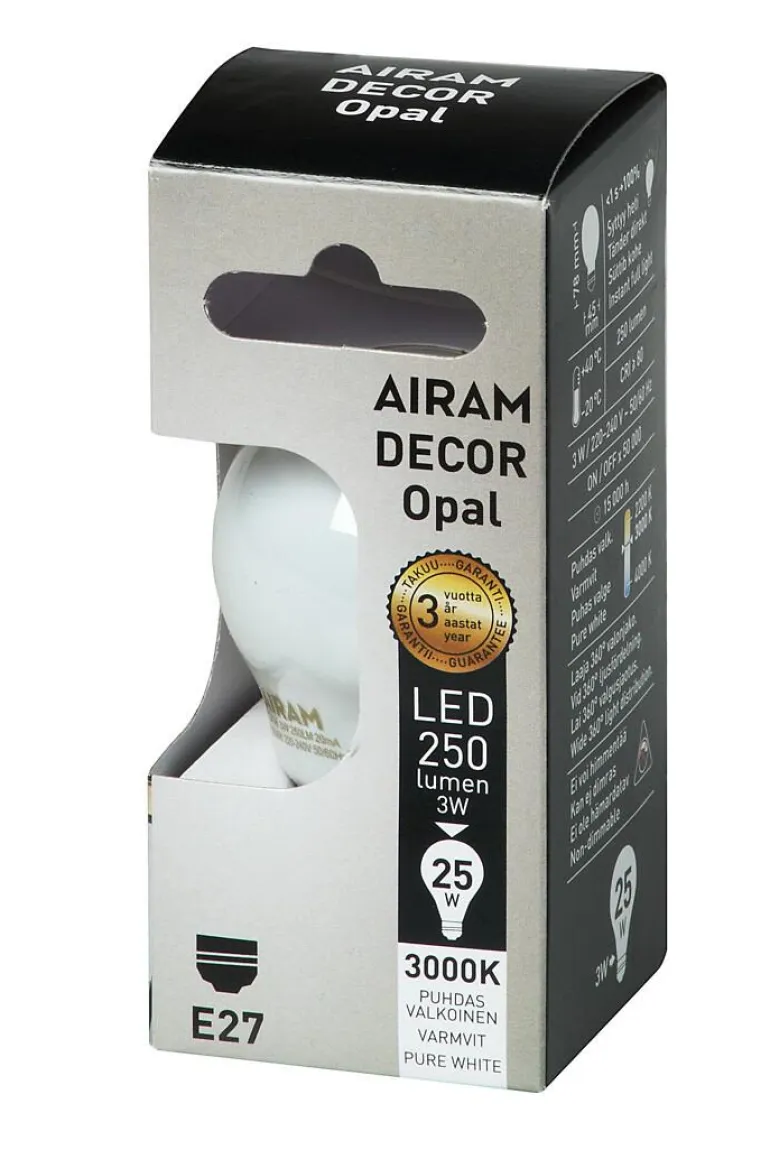 LED-lamppu täysin kattavalla 360:n asteen valonjaolla, mikä sopii hyvin esim. plafondeihin. Opaalikuvun ansiosta lampun valo ei häikäise vaikka ei olisikaan kupua valaisimessa. Valon värilämpötila on miellyttävä puhtaanvalkoinen (3000 K).