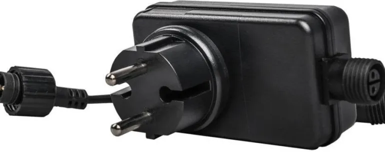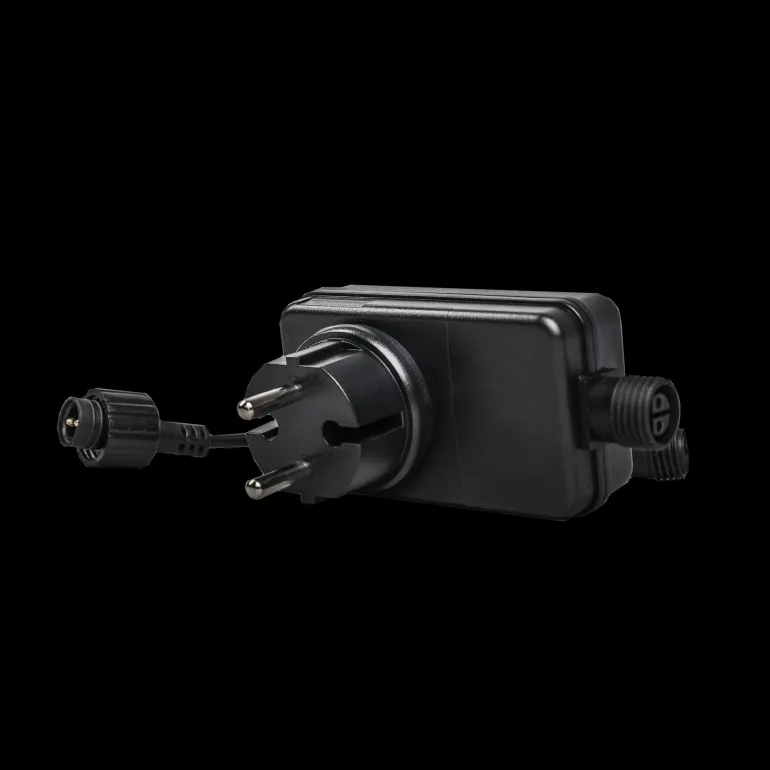 Pistokemuuntaja 12 V DC, IP44-luokituksella, Hide-a-Lite Garden -mallistoon. Mukana ruuviliitin helppoon ja nopeaan kytkentään.