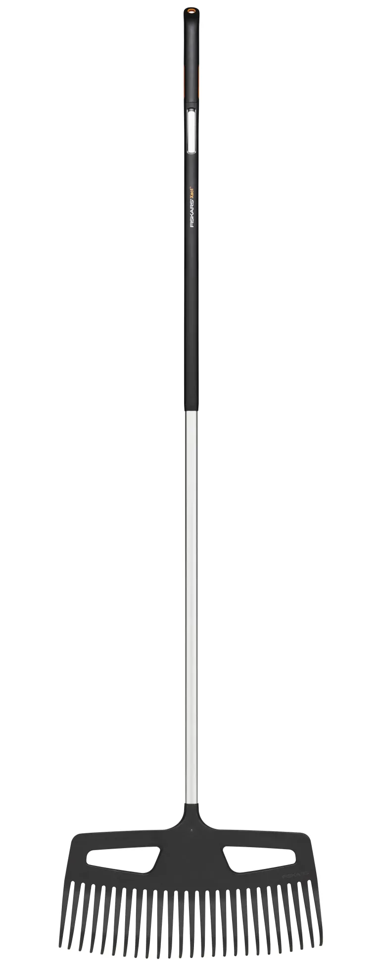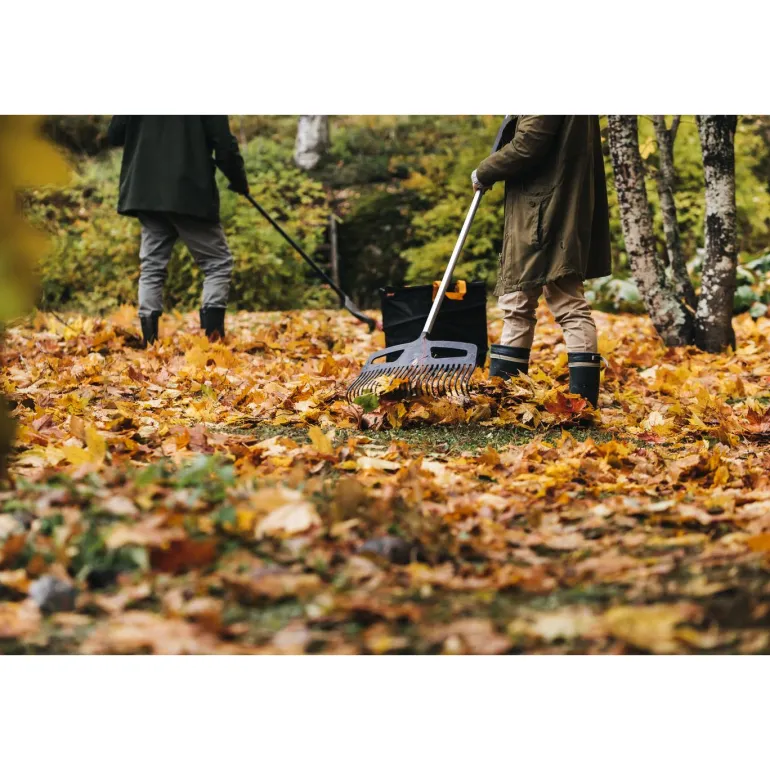 Leveä lehtiharava. Haravapäässä kahva, jotta lehtien kerääminen on helppoa. Varsi karkaistua alumiinia. 25 vuoden takuu.