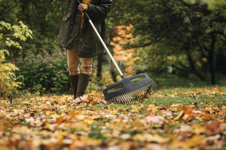 Erityisen leveä lehtiharava. Haravapäässä kahva, jotta lehtien kerääminen on helppoa.