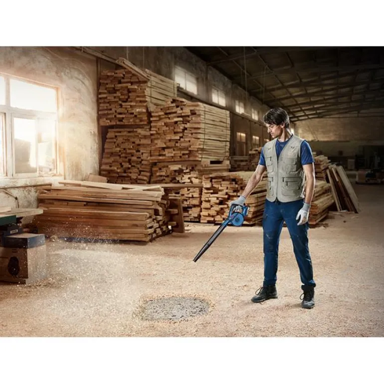 Bosch GBL 18V-120 Professional on 18 V:n puhallin/lehtipuhallin, jossa säädettävä ilmavirtaus ja tehokas suorituskyky 75 m/s:n ilmanpuhalluksella.
