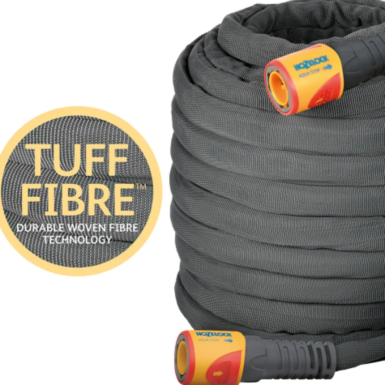 Kestävä puutarhaletku yhdistetyllä tekniikalla – sisempi kerros PVC:tä ja ulompi kerros kuitukangasta (Tuff-Fibre). Letku on kevyt, joustava ja kestävä.