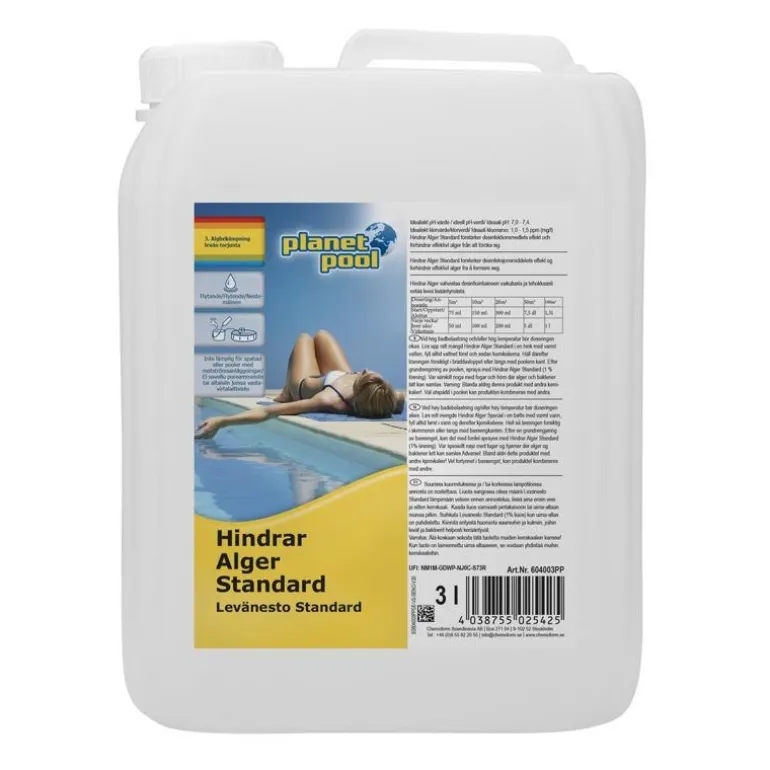 Planet Pool Levänesto Standard on leväntorjunta-aine, joka estää levien muodostumista. Tämä tuote on tehokas leväntorjunta-aine, joka on nestemäisessä muodossa ja sekoitetaan vesiämpäriin ennen altaaseen kaatamista. Leväntorjunta-aineita käytetään aina ennaltaehkäisevänä toimenpiteenä. Klooriton, heikosti vaahtoava. Levät muodostavat kasvualustan bakteereille ja siksi allas on pidettävä puhtaana levistä. Pinnan liukkaus voi olla ensimmäinen merkki levistä altaassasi. Käytä biosideja turvallisesti. Lue aina etiketti ja tuotetiedot ennen käyttöä. Pakkaus sisältää 3 litraa leväntorjunta-ainetta.