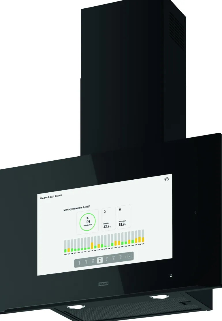 Franke AQ Sense on liesituuletin innovatiivisilla toiminnoilla ja 21,5″ kosketusnäytöllä. Sen avulla voit helposti selata internetiä, katsoa videoita ja kuunnella musiikkia sisäänrakennettujen kaiuttimien kautta. Liesituuletinta voi ohjata kolmella tavalla: äänikomennoilla, mobiilisovelluksella tai kosketusnäytön kautta. AQ Sense -liesituuletin on lisäksi varustettu sensorilla, joka mittaa ja reagoi keittiön ilmanlaatuun. Liesituuletin tarkkailee myös ilman lämpötilaa ja kosteutta raikkaan keittiön ja miellyttävän ympäristön varmistamiseksi.