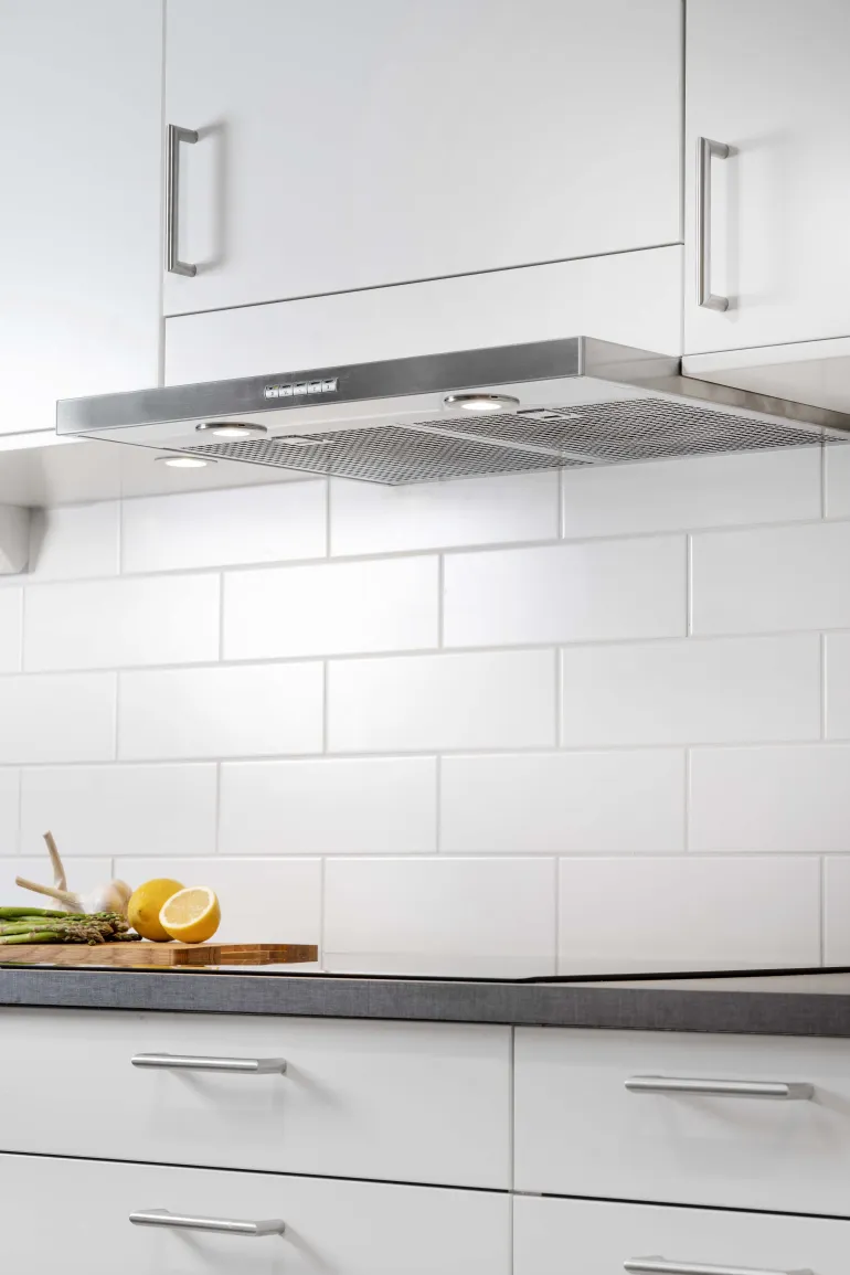 Asennustarvikkeet, kiinnitysruuvit jne. toimitetaan liesituulettimen mukana. Sähköliitännän on oltava kiinteä ja ennen liesituulettimen liitäntää on liitettävä kaikkinapainen kytkin. Liitäntä- tai pistorasiaan on päästävä käsiksi myös asennuksen jälkeen. Mukautettavissa liitäntään Ø125 tai Ø160 mm. Jos liitäntä on Ø125 mm, on käytettävä supistusmuhvia. Liitosletkulla asennettaessa letku on asennettava venytettynä lähimmäksi liitäntää. Lieden ja tuulettimen välisen etäisyyden on oltava vähintään 45 cm. Etäisyyden on oltava 65 cm kaasuliedelle.