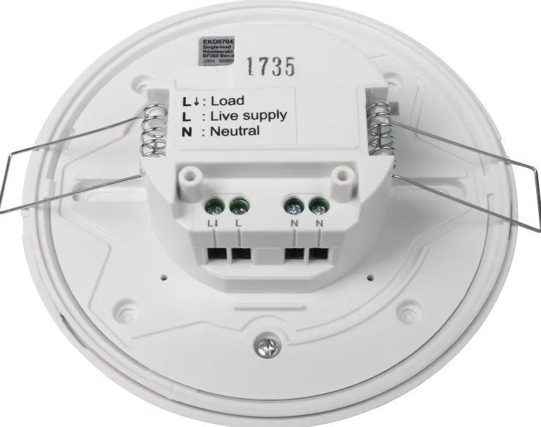 PIR, liiketunnistin sisä- ja ulkokäyttöön. Havaitsee tarkkailualueella liikkuvat lämmönlähteet ja voi sytyttää lampun joksikin aikaa. Käynnistyy uudelleen aina, kun liikettä havaitaan. 10A murtotoiminto, IP44-rungolla ulkoista asennusta varten, IP40 uppoasennus jousipidikkeellä. Voidaan aktivoida ulkoisella painikkeella tai pulsseilla porrasautomaattin. 360 pyöreä jopa 7m korkeudella 2,5 m (läsnäoloanturi 4m). Viive 5 s-30 min. Luksialue 10-2000 lux. Asennussyvyys 40 mm