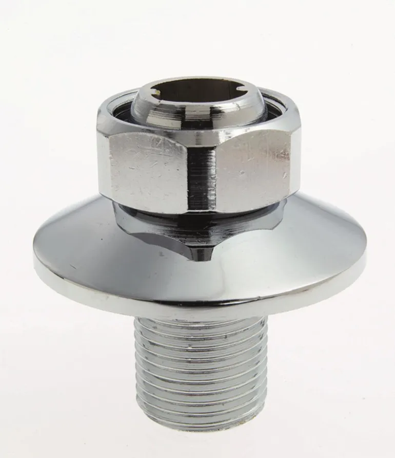 Suora kromattu liitäntäkytkin seinään, M34 x 1,5 -sisäkierre ja G20-ulkokierre sekä peitelevy (Ø 59 mm).