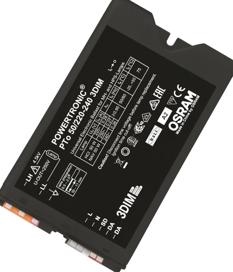 Elektroninen liitäntälaite purkauslampuille, suunniteltu ulkovalaistusta varten.