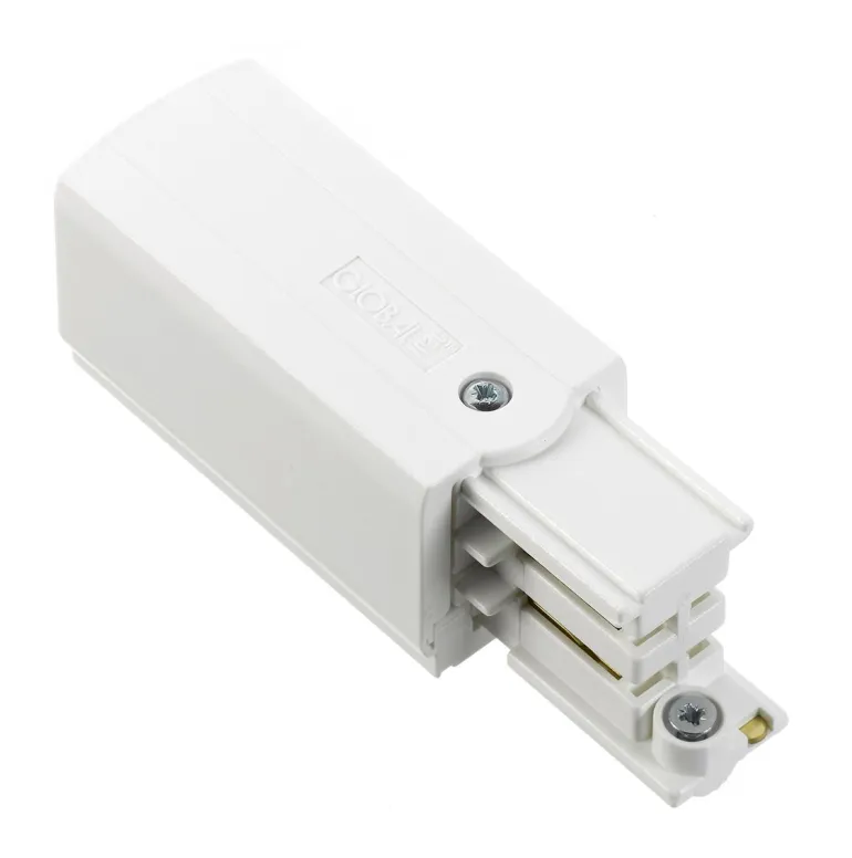 GLOBAL Trac XTS11-3 on valkoinen liitin 3-vaiheiselle kosketinkiskolle, vasemmanpuoleinen päätyosa. Lisävaruste GLOBAL Tracin kolmivaiheiseen kiskoon.