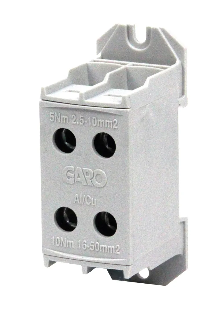 Garo GKL on liitinsarja 2,5-240 mm² kupari- ja alumiinikaapeleille DIN-kiskoasennusta tai ruuvikiinnitystä varten. Saatavana yksin- tai kaksinkertaiseen asennukseen kolmessa värissä: harmaa, sininen tai keltainen/vihreä.