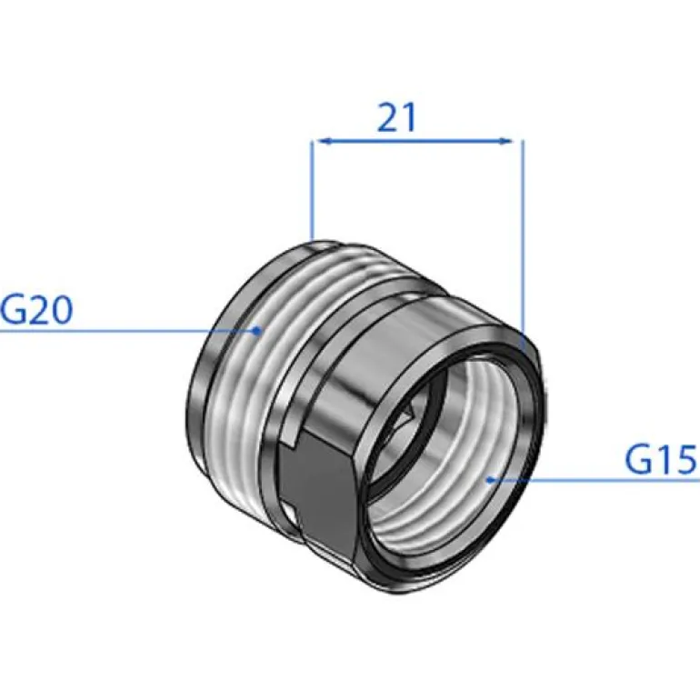 Trio Perfekta 970534 on kromipinnoitettu liitosnippa, mukana tiiviste. Toisessa päässä on G20-ulkokierre ja toisessa G15-sisäkierre. Liitosnipan korkeus on 21 mm.