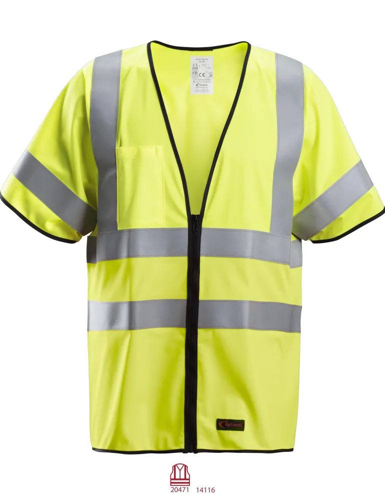 Palolta suojaava huomioliivi, jonka avulla voit nopeasti ja helposti lisätä näkyvyyttäsi tietöiden aikana tai hämärässä. Liivissä on lyhyet hihat luokan 3 mukaisesti.
