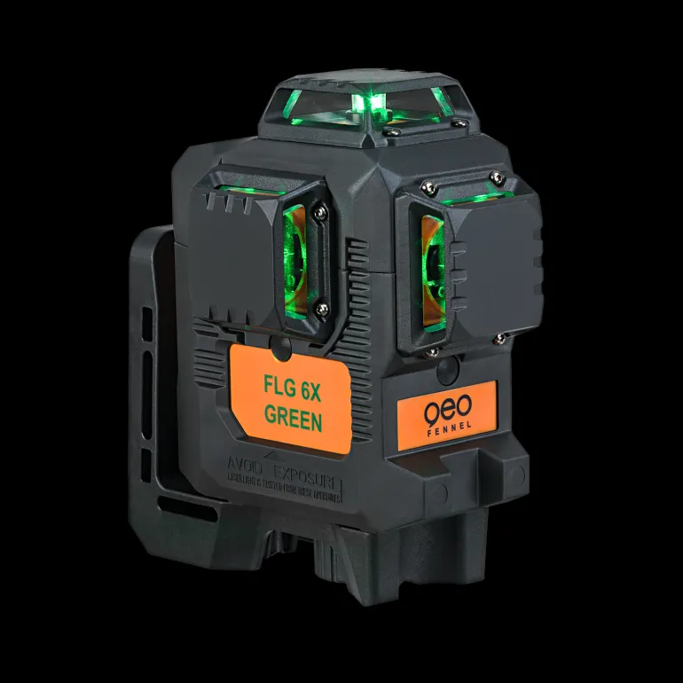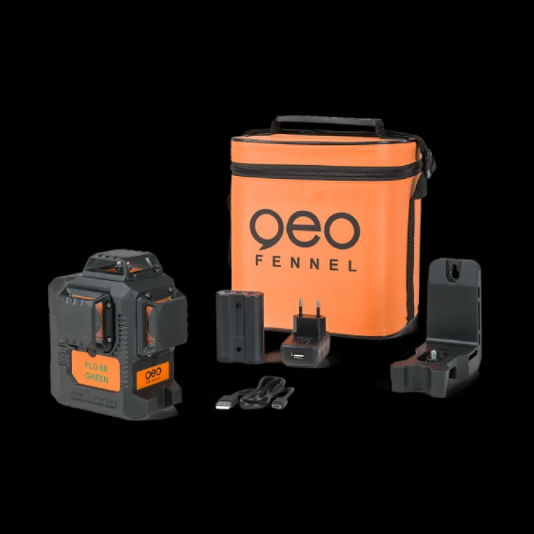 Geo Fennel FLG 6X-Green monilinjalaser, jossa 3 x 360° laserlinjaa jotka muodostavat kuusi laserristiä. Laserlinjat aktivoitavissa erikseen ja luotipistetoiminto. Työskentelyalue ilman vastaanotinta 30 m (säde). Itsetasaustoiminto voidaan lukita manuaalista käyttöä varten. Monitoimikiinnike (seinä/katto), jossa magneetit takana ja hihnakiinnike. 5/8″ & 1/4″ -jalustakierteet. Mukana akku, laturi USB-kaapelilla, monitoimikiinnike ja pehmustettu säilytyslaukku. Mahdollisuus myös jatkuvaan virransyöttöön USB-kaapelilla.