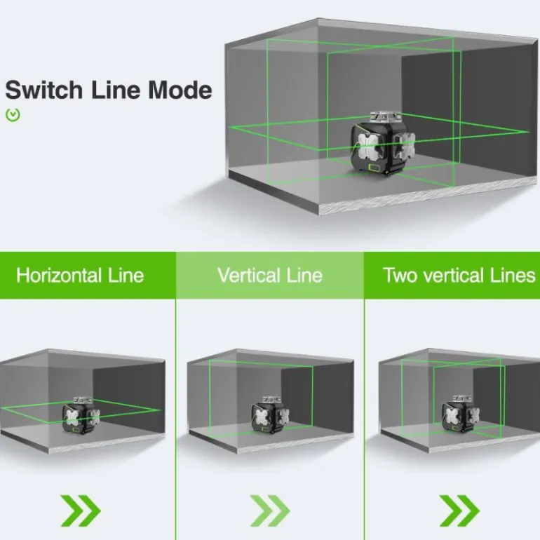Elma X360-3 hyödyntää edistyksellistä vihreää lasertekniikkaa, joka mahdollistaa jopa neljä kertaa paremman näkyvyyden kuin perinteiset punaiset laserit. Selkeästi näkyvät, vihreät laserlinjat näkyvät selvästi kauempaakin, sekä sisä- että ulkotiloissa. Elma X360-3 mahdollistaa halutessa 360˚:een linjojen projisoinnin koko laitteen ympäri kokonaisvaltaista merkitsemistä varten ilman, että sinun tarvitsee tehdä merkintöjä seiniin, lattiaan tai kattoon (vaihtoehtoina yksi vaakasuuntainen linja, yksi pystysuuntainen linja tai yksi vaaka- ja kaksi pystysuuntaista). 360˚:een vaaka- ja pystylinjojen lisäksi voit tehdä myös linjoja vinokulmissa, joka voi olla hyödyksi esim. portaiden tai kaiteiden merkinnässä. Lukitustoiminnolla voidaan deaktivoida itsevaaitus ja asettaa linja/linjat vinoon käyttämällä kallistuspäätä. Kun laite on lukittu ilmaistaan tämä lyhyen vilkkumisen avulla – vilkkuen noin kolmen sekunnin välein – jotta ei käyttäjä virheellisesti luulisi viivojen olevan pysty- ja vaakasuorassa.