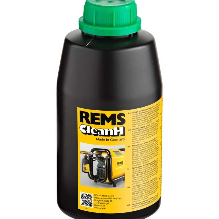 REMS CleanH on 1 litran pullo REMS CleanH -puhdistusainetta lämmitysjärjestelmiin, vihreä väri täytön ja huuhtelun valvontaan, n. 100 litran tilavuudelle.