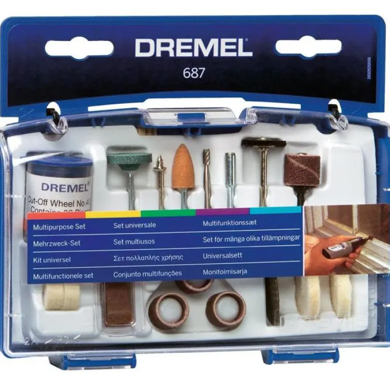 Lisätarvikesarja monta eri käyttökohdetta varten. Valikoima tavallisimpia tarvikkeita kätevässä laatikossa. Irrotettava lisätarvikelokero, jossa on kolme jakajaa kätevää säilytystä varten. Toimitetaan joustavassa säilytyslaukussa.