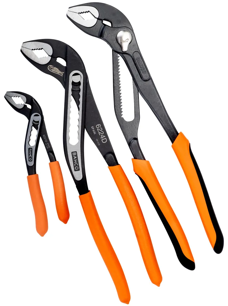 Liukunivelpihtisarja, joka sisältää 7224 pikasäädettävät, 6224D ja 6221D liukunivelpihdit. Pakattu pussiin.