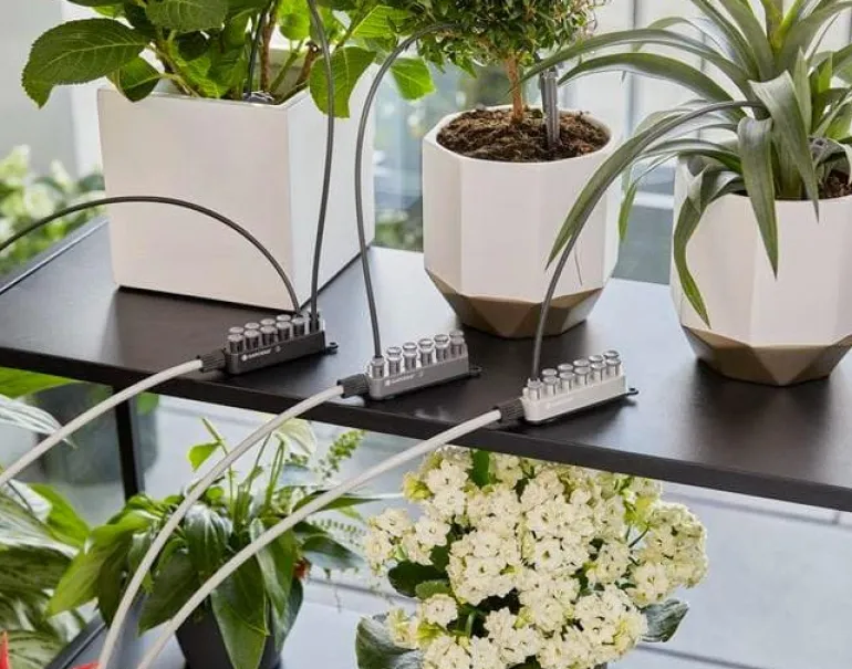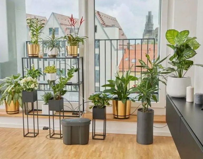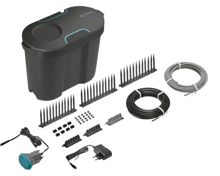 Lomakastelusarja sisältää kaikki tarvittavat yksittäiset osat ja se on heti käyttövalmis. Kastelujärjestelmä on helppo ottaa käyttöön. Mukana toimitettava vesisäiliö on valmistettu 80-prosenttisesti kierrätetystä materiaalista. Pumppu on mahdollista kiinnittää säiliön pohjalle optimaalisen vedenkäytön varmistamiseksi. Säiliötä voidaan käyttää myös käytännöllisenä säilytysratkaisuna sarjan komponenteille. Kapean muotoilun ansiosta kastelusarjan säiliö voidaan sijoittaa huomaamattomasti esimerkiksi huonekalujen taakse. Voit käyttää kastelusarjaa halutessasi myös parvekkeella. Vesisäiliön tilavuus on 10,5 litraa.