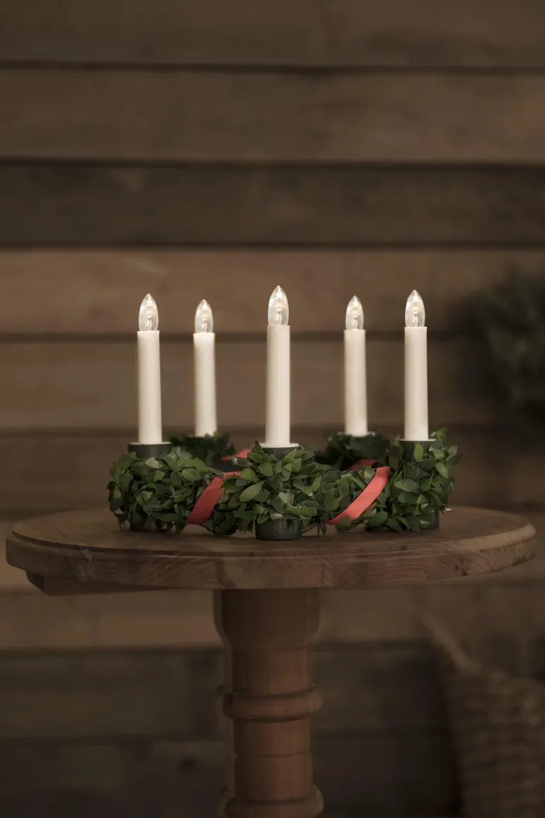 Konstsmide 1181-000 on Lucia-LED-kruunu (vihreä koristeilla, 5 LED-kynttilää), 5xAA.