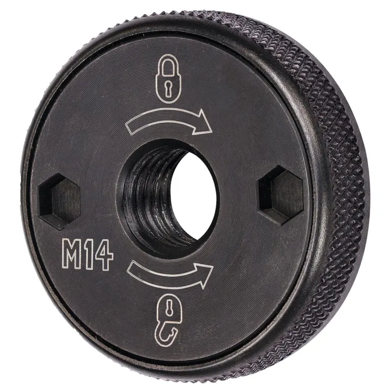 Dewalt-kulmahiomakoneiden lukkomutteri. Mutterissa on M14-kierre, paksuus 12 mm.
