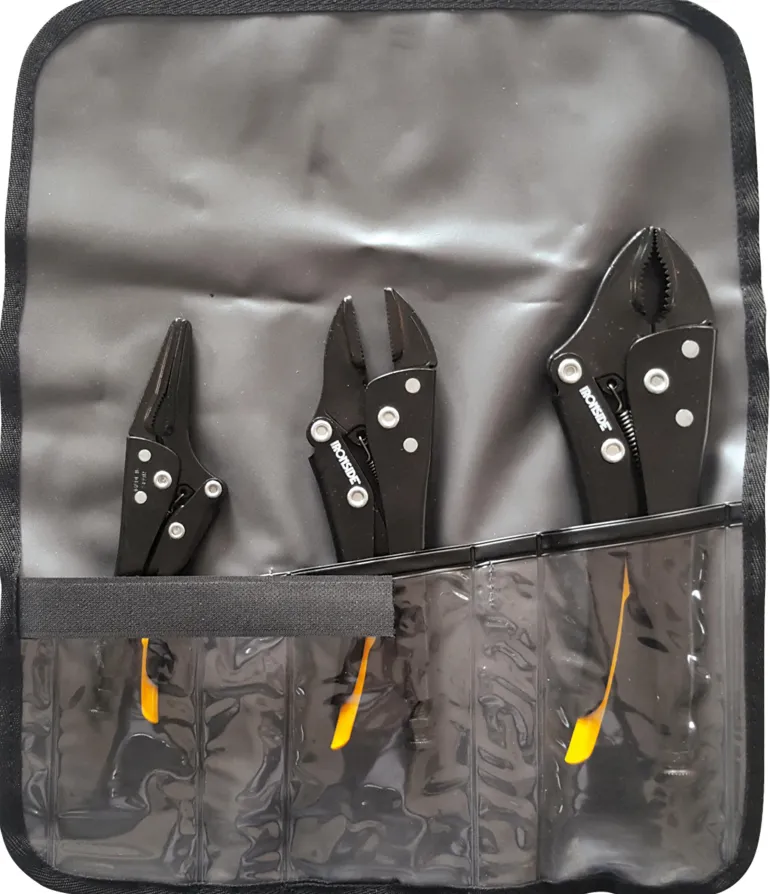 Sarja, jossa kolme itselukittuvaa ja pehmeästi avautuvaa lukkopihtiä: Kärkilukkopihdit 176 mm, lukkopihdit leikkurilla 238 mm, suoraleukaiset lukkopuhdit 192 mm. Epoksipinnoitetut. Toimitetaan muovikotelossa.