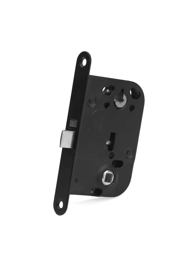 Lukkorunko 62014, musta. Symmetrinen lukkorunko teräksestä välioviin. Sopii sekä oikea- että vasenkätisiin oviin käännettävän kielen ansiosta. Tarvittaessa suositellaan vastarautaa Habo 6510.