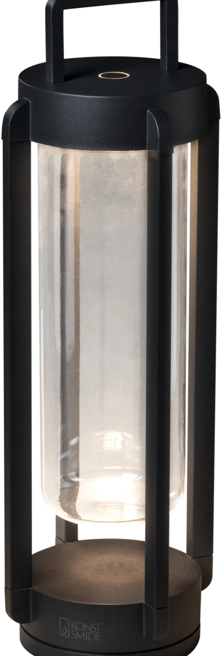 Alumiinista ja lasista valmistettu musta lyhtyvalaisin ulkokäyttöön. Lyhty on himmennettävä ja ladattavissa USB:llä.