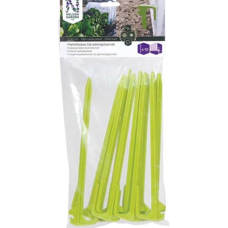 Viljelytunnelin kiinnittimet, kaksi toimintoa: Kiinnittää tunnelin maahan ja edistää ilmanvaihtoa. Valmistettu polypropeenista (PP).
