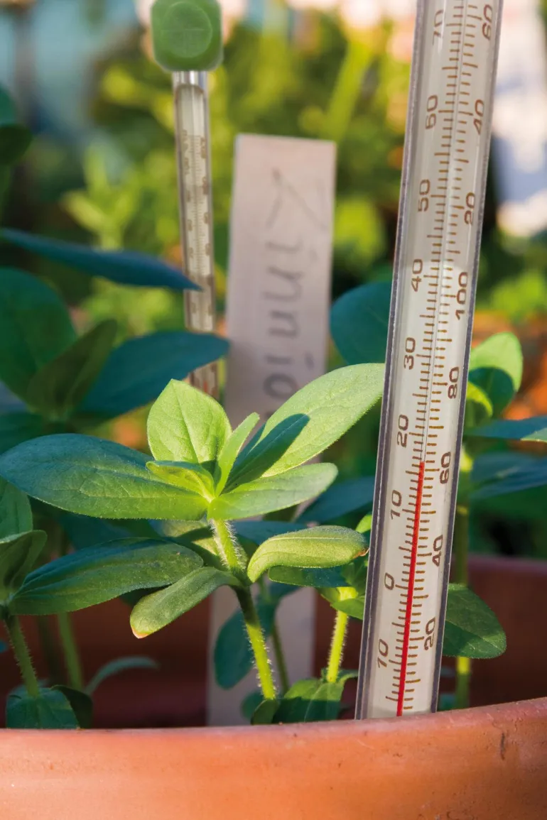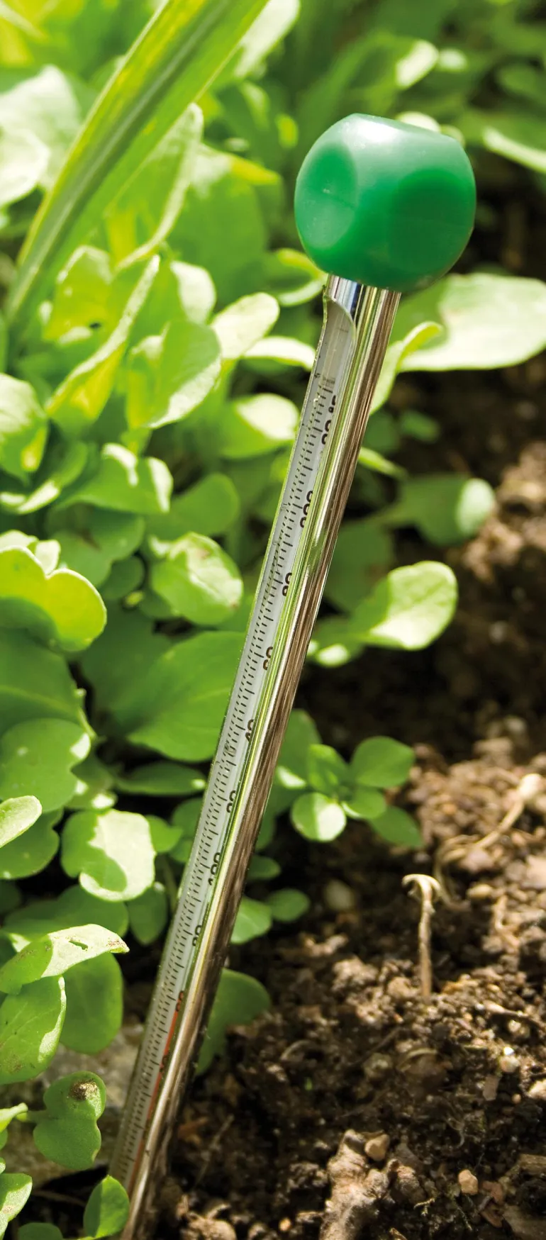 Maalämpömittarin avulla on helppo tarkistaa kylvöalan lämpötila. Tämä on erittäin tärkeää suorakylvössä, esim. pavuilla ja kurkulla maan tarvitsee olla vähintään 15°.