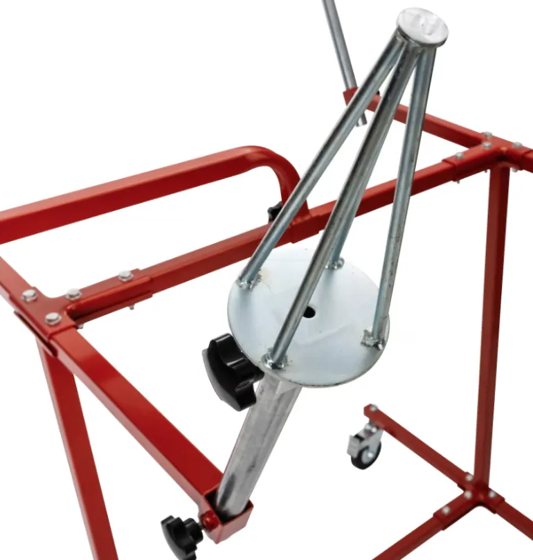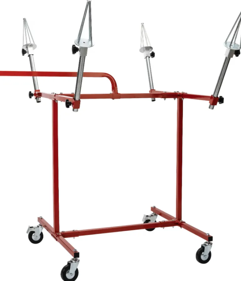 PELA 506568 on maalausteline 4 säädettävällä varrella, joissa on kartiomainen yläosa vanteiden ripustamista varten. Teline on varustettu 4 pyörällä, joista 2 lukittavia ja kahvalla siirtämistä varten. Mitat: 950×1130,5×1260 mm.
