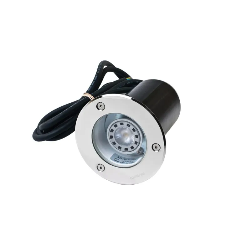 Maavalaisin, jonka etuosa on ruostumatonta terästä (316L). Valaisinkotelo alumiinia ja 10 mm:n karkaistua lasia. Hyväksytty yliajettavaksi. Mukana upotuskotelo polypropeenia hautaamista tai upottamista varten. Teräksinen sisääntulonippa Ø 6,5-7,5mm:n kaapelille. Mukana 3 metrin valmiiksi asennettu kaapeli.