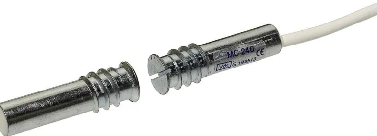 NC-toiminnolla varustettu magneettikytkin, uppoasennus oviin ja ikkunoihin. Sekä kytkin- että magneettiosat on valmistettu metallista. Muotoiltu ruuviksi, jossa on kierteet, mikä mahdollistaa helpon asennuksen puuhun tai muoviin. Kytkimen rinnalla on vastus. Kaapeli 2 m. Suositeltu poranterän halkaisija 9-10 mm