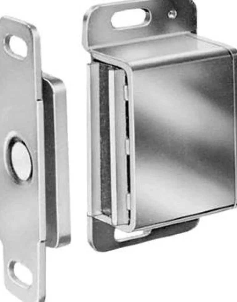 Magneettilukko nikkelipinnoitettua sinkkiä. Kokonaispituus 46 mm.