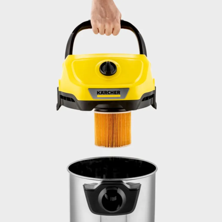 Kärcher WD 3 S karkeaimuri on vahva ja energiatehokas, ja sen tehontarve on vain 1 000 wattia. Kone, imuletku ja napsauttamalla kiinnitettävä lattiasuutin sopivat optimaalisesti yhteen parhaiden puhdistustulosten saavuttamiseksi, olipa kyse sitten kuivasta, märästä, hienosta tai karkeasta liasta. Märkä- ja kuivaimuri tekee vaikutuksen kompaktilla rakenteellaan ja vankalla, ruostumattomasta teräksestä valmistetulla 17 litran säiliöllä, 4 metrin verkkojohdolla, 2 metrin imuletkulla ja fleece-suodatinpussilla. Patruunasuodattimen ansiosta sekä märkää että kuivaa likaa voi imuroida ilman suodattimen vaihtoa. Puhallustoiminto on hyödyllinen vaikeapääsyisten alueiden puhdistuksessa. Letkua säilytetään ripustettuna koneen päällä, mikä säästää tilaa. Työkaluja ja pieniä osia voi myös säilyttää koneen päällä. Verkkojohtoa voi säilyttää johtokoukussa ja pölynimurin putkea ja lattiasuuttimia puskurissa. Pull & Push lukitusjärjestelmä helpottaa säiliön avaamista ja sulkemista. Pölynimurin kahvan voi irrottaa ja lisävarusteet voi kiinnittää suoraan imuletkuun. Laitetta on kätevä kuljettaa ergonomisesti muotoillun kantokahvan ansiosta.