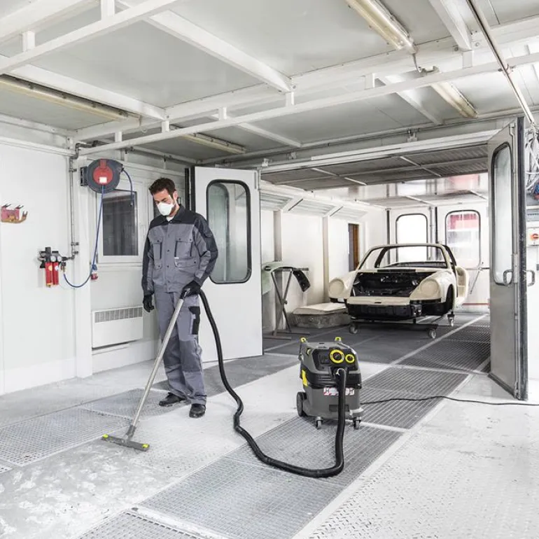 Vahva ja kestävä NT 30/1 Tact Te märkä-kuivaimuri innovatiivisella suodattimen puhdistusjärjestelmällä ja integroidulla sähkötyökaluliitännällä. Pölyluokka H. Mukana antistaattinen varustus.