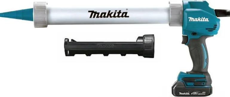 Makita DCG180 on 18 V:n massapuristin, pidike 310 ml:n ja 600 ml:n patruunoille. Portaaton nopeudensäätö ja työntövoima 5000N.