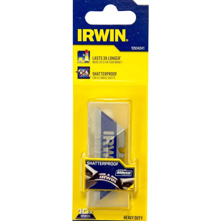 Irwin 10504241 on 10 kappaleen pakkaus yleiskäyttöisiä mattoveitsenteriä bimetallista. Bimetalli muodostetaan hitsaamalla pikateräsreuna jousiteräkseen, joka antaa materiaalille kestävyyttä ja pidemmän käyttöiän.