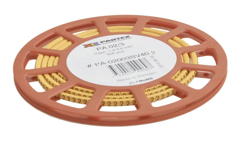 Keltainen mustalla tekstin värillä. Kapeina 500 kpl:een rullina. Johdon pinta-alalle ~ 0,2–1,5mm² ja johdon halkaisijalle 1,3–3,0 mm.