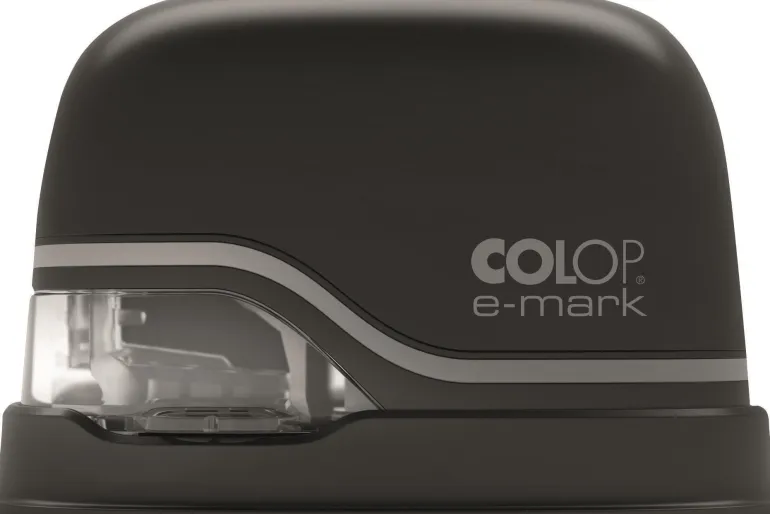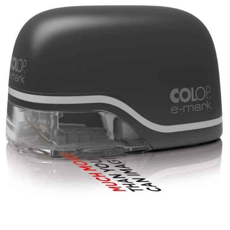 Colop e-mark on innovatiivinen elektroninen leimaus- ja merkintälaite, joka auttaa sinua tekemään nopeasti ja helposti klassisia leimoja, logojen, kuvien ja tekstien voimakkailla 4-väripainatuksilla kaikenlaisille papereille, kirjekuoriin, kartongeille, kirjoihin ja paperipusseihin. Tiedonsiirto tapahtuu langattomasti Wi-Fi-yhteydellä tietokoneelta, puhelimesta tai tabletilta. Malleja ja kuvia voi myös tallentaa myöhempää käyttöä varten. Tulostuskoon leveys on 150 mm ja korkeus 14 mm sivuttaisliikkeellä. Tulostaa 600 dpi:n resoluutiolla. Mukana toimitetaan mustepatruuna, käyttöohje, USB- ja latauskaapeli