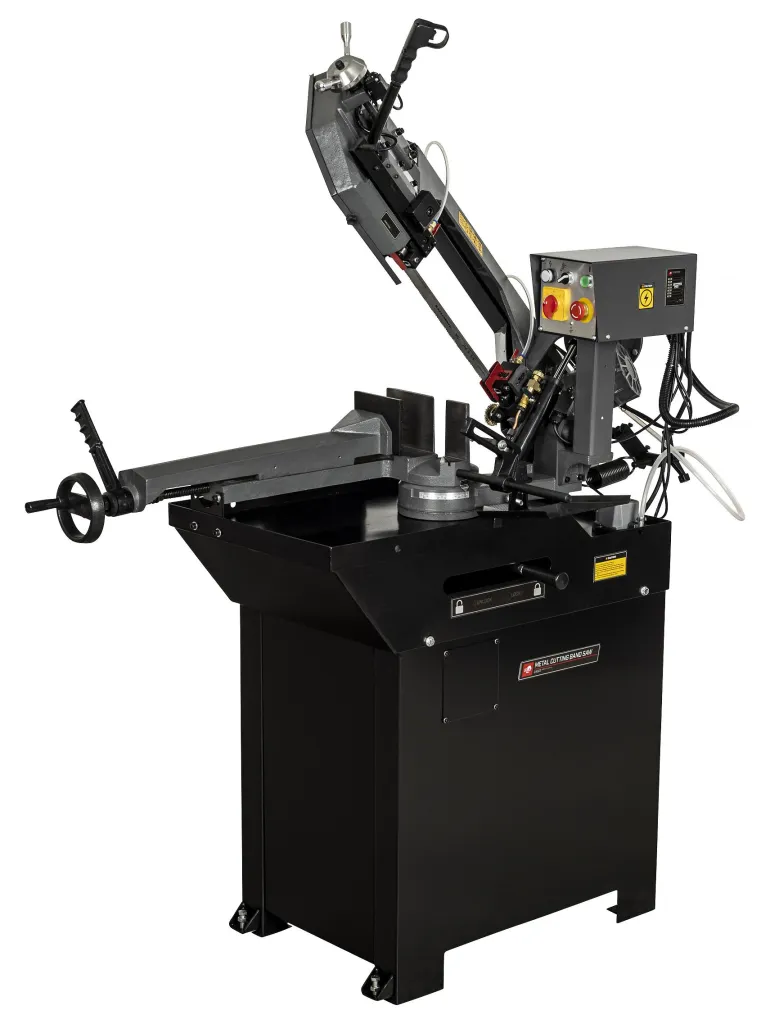Puolimanuaalinen vannesaha 1100 W teollisuuskäyttöön. Sahakaaren nosto manuaalisesti ja lasku hydraulimännän ja säätöventtiilin avulla. Sahakaari on säädettävissä jiirikulmiin 0-60°, lukitus vivulla.