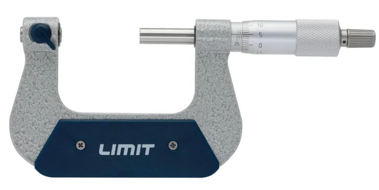 Mikrometri, jossa on taottu sanka ja mattakromattu asteikko. Karkaistu kara, jossa on vaihdettavat mittakärjet eri kierteille (ei sisälly toimitukseen).