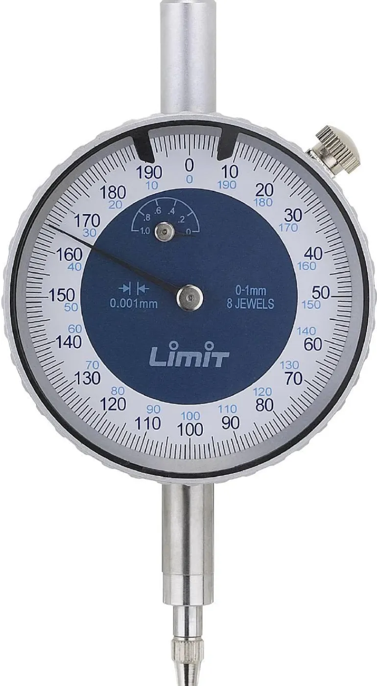 Kääntyvä asteikko ja kaksi säädettävää toleranssimerkkiä. Ylimääräinen osoitin, asteikolla 0,2 mm – koko mm. Alumiinirunko. Vaihdettava mittakärki. Ilman kiinnityskorvaa. DIN 878 -standardin mukainen toleranssi.