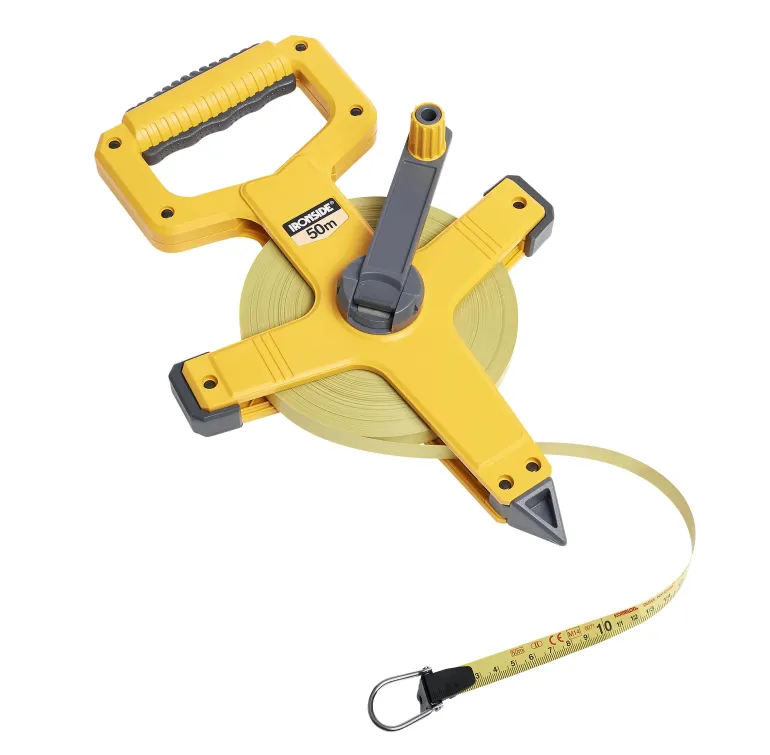Keltainen mattapintainen teräsmitta, jossa silmukka ja koukku päässä. Muovinen runko, kädensija ja taittokampi. Toleranssi EU:N tarkkuusstandardin mukaan II.