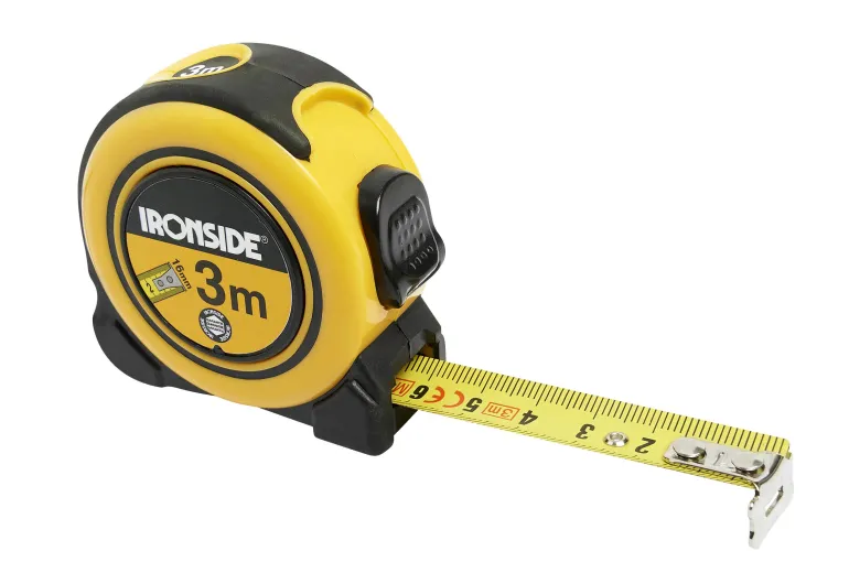Keltainen nylonpinnoitettu teräsmittanauha, jossa liikkuva päätykoukku. Kelausmekanismissa jarru sekä vaimennus päätykoukun suojaksi. Selkeä millimetriasteikko. Kumitettu ABS-kuori. Toleranssi EU:n tarkkuusnormi II. Käsilenkki