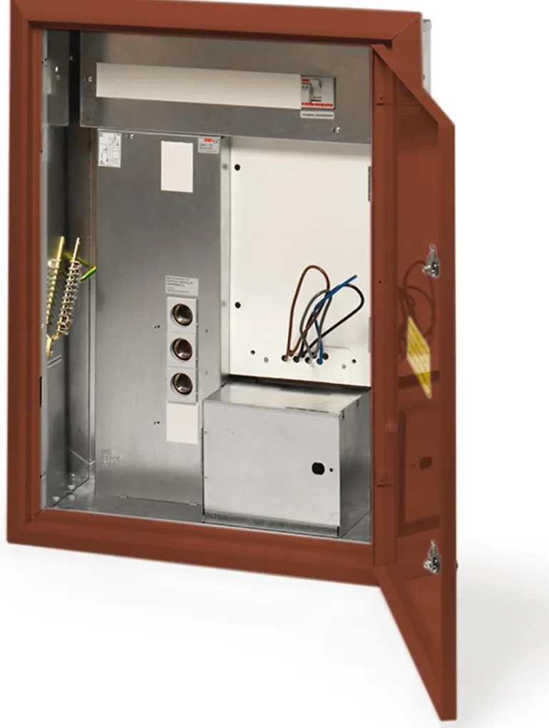 Mittarikaappi metallilevyä, uppoasennukseen. Potentiaalin tasauskisko (tyyppi PUS) toimitetaan vakiona PE-paneeliin kytkettynä kaikissa uppoasennettavissa kaapeissa.