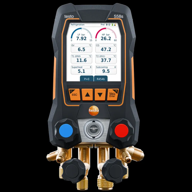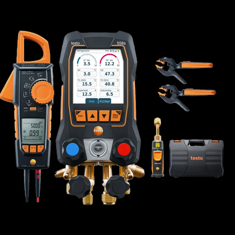 Testo 558s 4-tie mittarisarja on ammattikäyttöön tarkoitettu ja täydellinen mittaussetti kylmä- ja lämpöpumpputekniikkaan. Se on varustettu digitaalisella 4-tie mittarisarjalla, langattomilla putkilämpötila-antureilla (testo 115i), vakuumianturilla (testo 552i) sekä pihtiampeerimittarilla (testo 770-3). Suuren värinäytön ja intuitiivisen kosketusnäyttötoiminnon ansiosta 558s tarjoaa nopean ja sujuvan konfiguroinnin, valvontaominaisuudet ja dokumentoinnin.