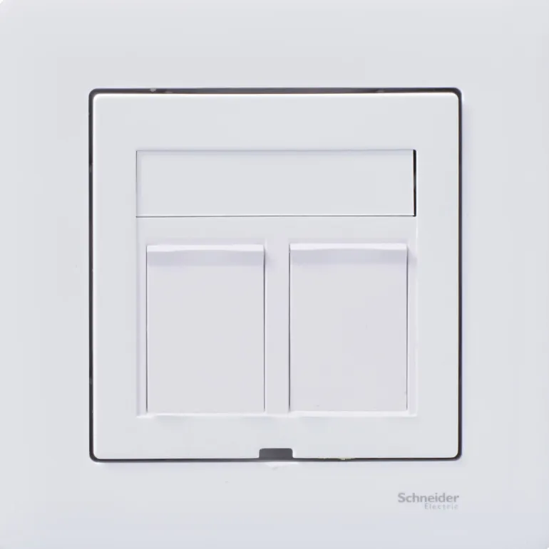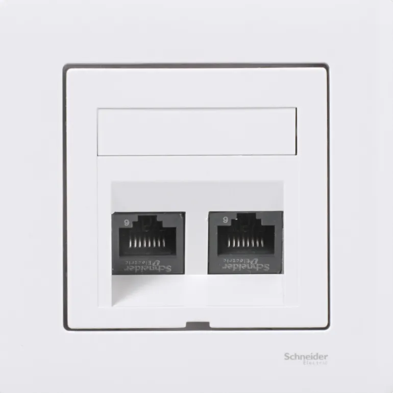 Schneider Exxact 2xC6 UTP WDE002424 on valkoinen modulaarinen pistorasia, jossa on litteä muotoilu upotettavaksi. Sarjassa on 2 Kat 6 UTP S-One -modulaarinen jakkiliitin, 1 levytukikehys kojerasiaan c/c 60 mm ja 1 valkoinen litteä keskilevy pölyluukuilla. Värikoodi ja etiketin paikka.