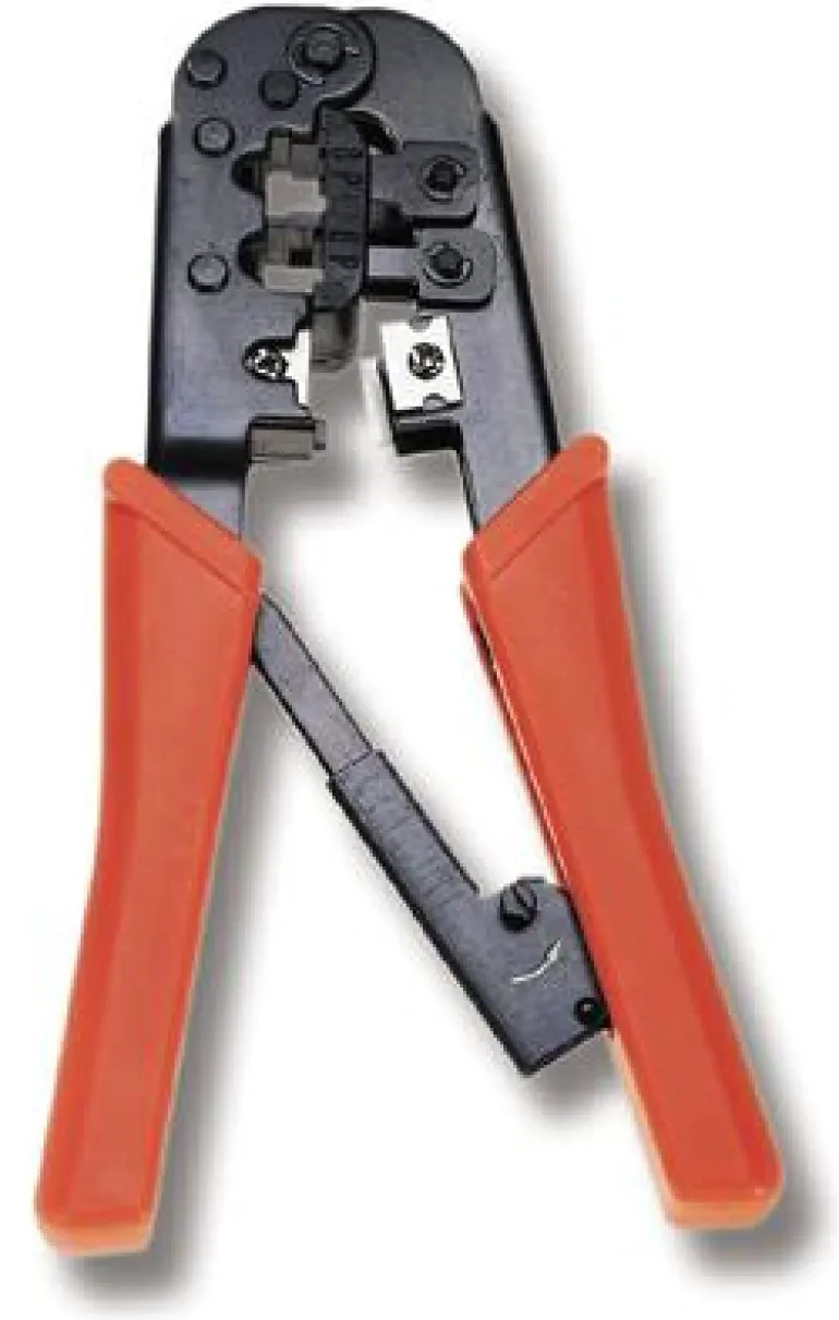 Puristustyökalu modulaarisille liitännöille. Kuorii ja katkaisee kaapelin ja purista kaapelin liittimet.